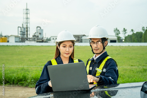 Two industrial engineers—a man and a woman—wearing safety helmets and reflective vests are working together on a laptop at a factory site during twilight. The image conveys teamwork, industrial techno