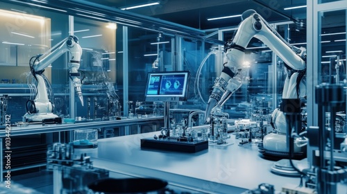 Two Industrial Robots Working on a Production Line in a Modern Factory