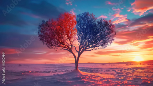 Two intertwined trees, their branches forming the shape of a heart, against a backdrop of a colorful twilight sky,surrealistic scene. Generative AI