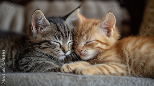 Two kittens sharing a tender moment on a sofa surrounded by a cozy home setting with soft focus.