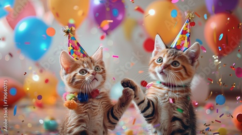 Two kittens wearing party hats in front of a colorful background of balloons and confetti