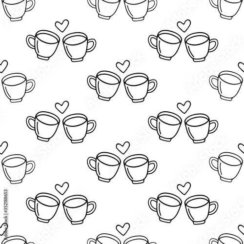 Two large mug of coffee or cocoa hand-drawn for lovers. Vector seamless doodle pattern on white background. Design for textile, print