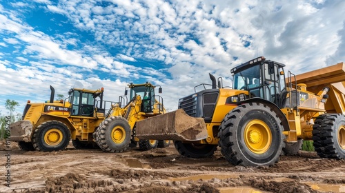 Two large yellow construction loaders carrying soil, with a vibrant blue sky and clouds in the background, showcasing a construction or mining setting