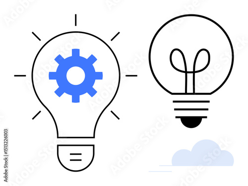 Two light bulbs, one featuring a gear symbolizing innovation and problem-solving, and another plain with a glowing filament for inspiration. Ideal for ideas, creativity, teamwork, technology