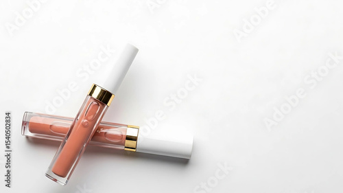 Two lip gloss tubes with white caps and gold accents on a plain white background in a flat lay style