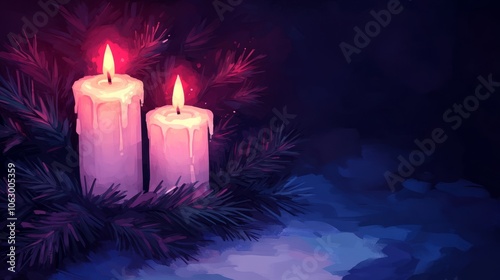 Two lit candles surrounded by evergreen branches, creating a warm ambiance.