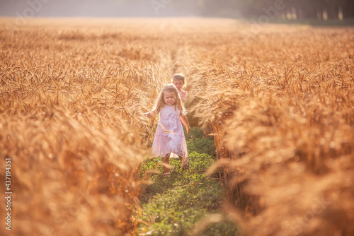 Two little girl friends are running, playing catch-up in a wheat field. Sisters are having fun. Golden rye after rain with water drops. Summer walks, agro tours in the countryside on the farm