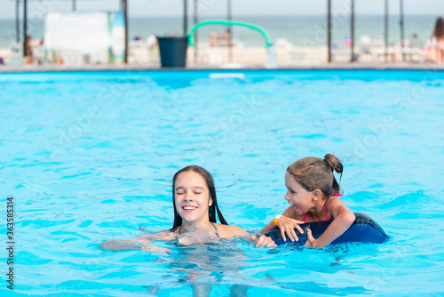 Two little sisters girls are swimming in a large pool with clear blue water of mine near the hotel on the background of the sea and the beach. Concept vacation tropical hot country with children