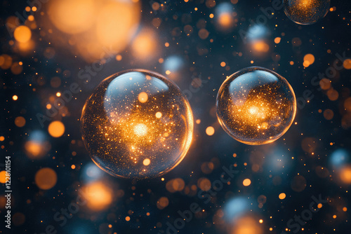 Two luminous orbs, filled with golden sparks, float in a dark, bokeh-filled space.