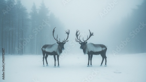 Two majestic reindeer stand facing each other in a snowy, foggy forest.