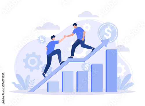 Two mans, goal focused, increase motivation, way to achieve the goal, support and teamwork. Modern vector flat illustration