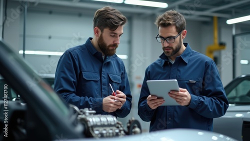 Two Mechanics Discussing Repairs While Using a Tablet in a Modern Workshop Setting During Daytime
