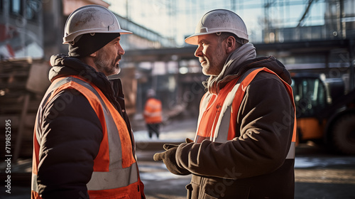 two men at a construction site who are talking to each other discussing, both with safety helmets