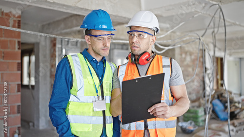 Two men builders reading document speaking at construction site