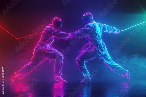 Two men engaged in a fencing match. Suitable for sports and competition concepts