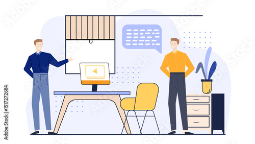 Two men in office discussing video on computer, suitable for business, technology, communication or teamwork concepts in presentations or designs.