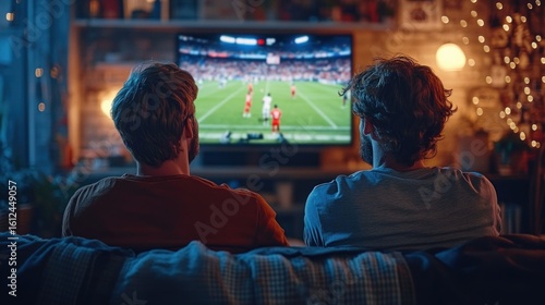 Two men sitting on a couch watching a live soccer match on a large TV in a cozy, dimly lit living room with warm ambient lighting and festive string lights