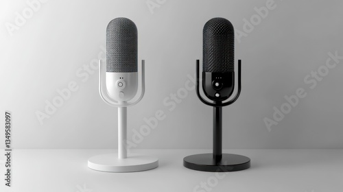 Two microphones, studio setup, podcasting, white background, recording audio