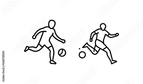 Two minimalist line art figures playing soccer with a ball