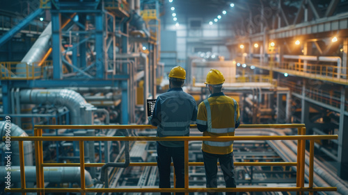 Two multiethnic engineers stand on a platform using a laptop at an electronics factory, monitoring machine maintenance progress via online software.