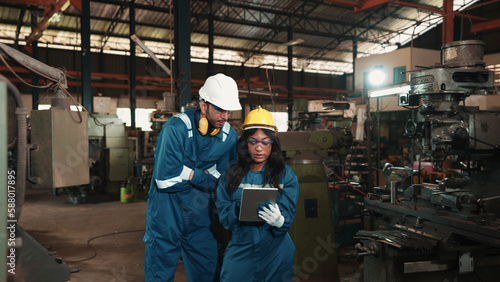 Two multiracial factory workers in safety wear are using a tablet to plan for working at a metalwork production factory. Male and female production engineers are examining the status of manufacturing.