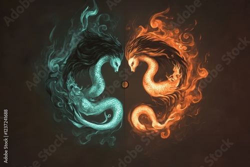 Two mythical dragons, fire and ice, intertwined, dark background, fantasy art for gaming or book covers.