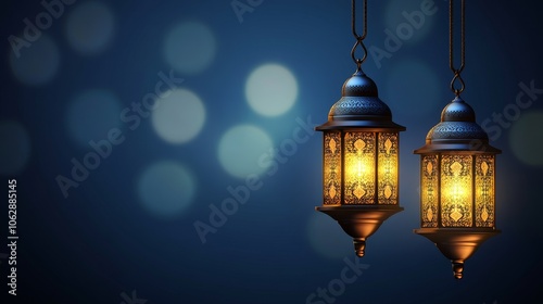 Two ornate lanterns glowing softly against a dark blue background with bokeh lights.
