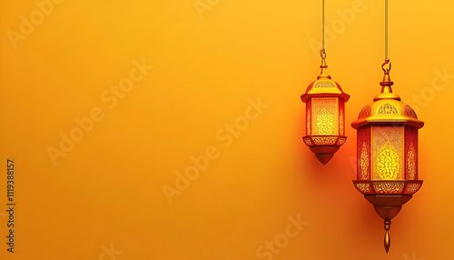 Two ornate lanterns hanging against a bright orange background, symbolizing warmth and celebration.