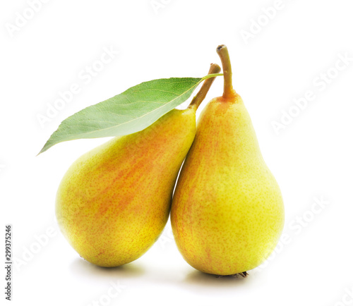 Two pears with a leaf.