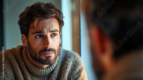 Two people are sitting opposite each other and talking in a warm atmosphere. One of them is wearing a cozy sweater. The frame is dominated by soft and warm shades, creating a comfortable mood