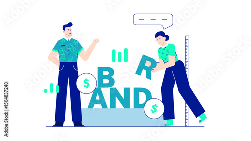 Two people constructing the word brand together, ideal for marketing, business concept, teamwork, collaboration graphics, and branding designs.