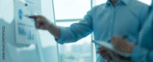 Two people discuss data on a chart in an office setting.