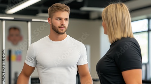 Two people engaged in a focused conversation at the gym.