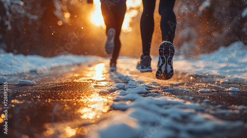 Two people enjoy a morning run on a path blanketed with snow, illuminated by the breathtaking sunrise in a tranquil winter landscape..