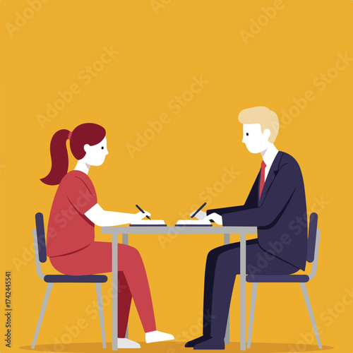 Two people in an office setting are writing at a table