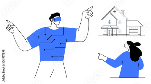 Two people, one wearing a VR headset, point toward a modern house. Ideal for technology, smart homes, virtual reality, family interaction, and futuristic innovations. Minimalist line art style