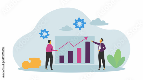 Two people pointing at a bar graph with an upward arrow, gears, and coins indicating business growth