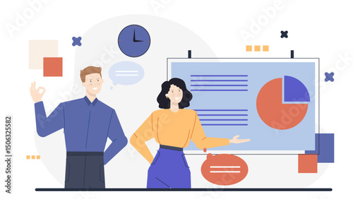 Two people presenting a pie chart. Suitable for business meetings, data analysis, financial presentations, teamwork in office settings.