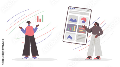Two people presenting data dashboards with charts and graphs in a modern style illustration