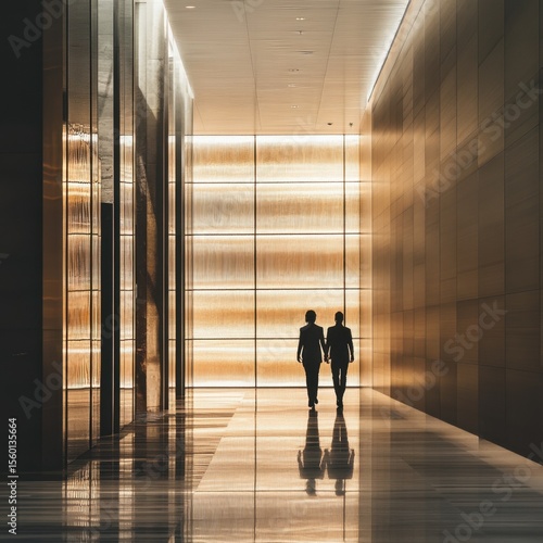 Two people walking in a modern building hallway with reflective floor and decorative wall panels