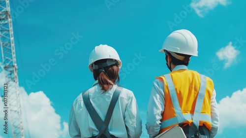 Two people wearing hard hats and safety vests stand next to each other. They are looking at something in the distance