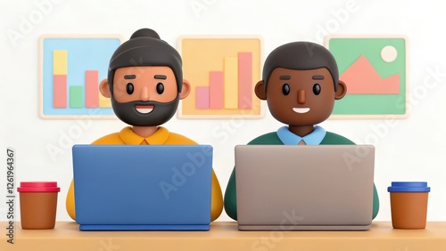 two people working at their desks, with coffee cups and charts in the background, showcasing collaboration and productivity. Their faces reflect focus and engagement.