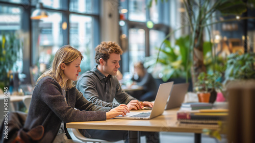 Two people working on laptops in a cozy caf?, casual clothing, blurred caf? background, concept of remote work, Generative AI. Generative AI