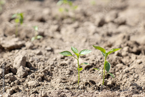 Two pepper sprouts. Planting a young seedling of pepper. Organic gardening. Step-by-step planting of sprouts.