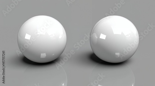 Two Perfect White Spheres on a Grey Reflective Surface Ideal for Backgrounds or Abstract Designs