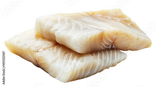 two pieces of raw fish fillet. showcasing a pale. translucent texture with subtle lines indicating the muscle structure the clean. white background emphasizes the freshness and quality of the fish. ma