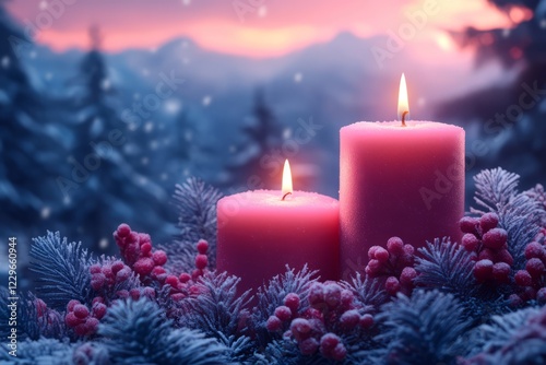 Two Pink Candles Glow Warmly Amidst A Snowy, Wintery Landscape, Creating A Cozy And Peaceful Christmas Scene.