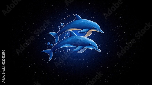Two Playful Dolphins Swimming Together in Deep Blue Ocean Background with Bubbles