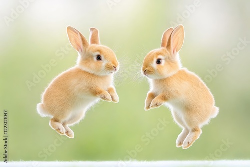 Two playful rabbits jumping in a bright, soft-focus background of greenery, symbolizing joy