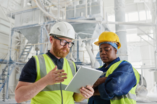 Two professional engineers with tablet scrolling through online manual guide while seeking for information about machinery usage